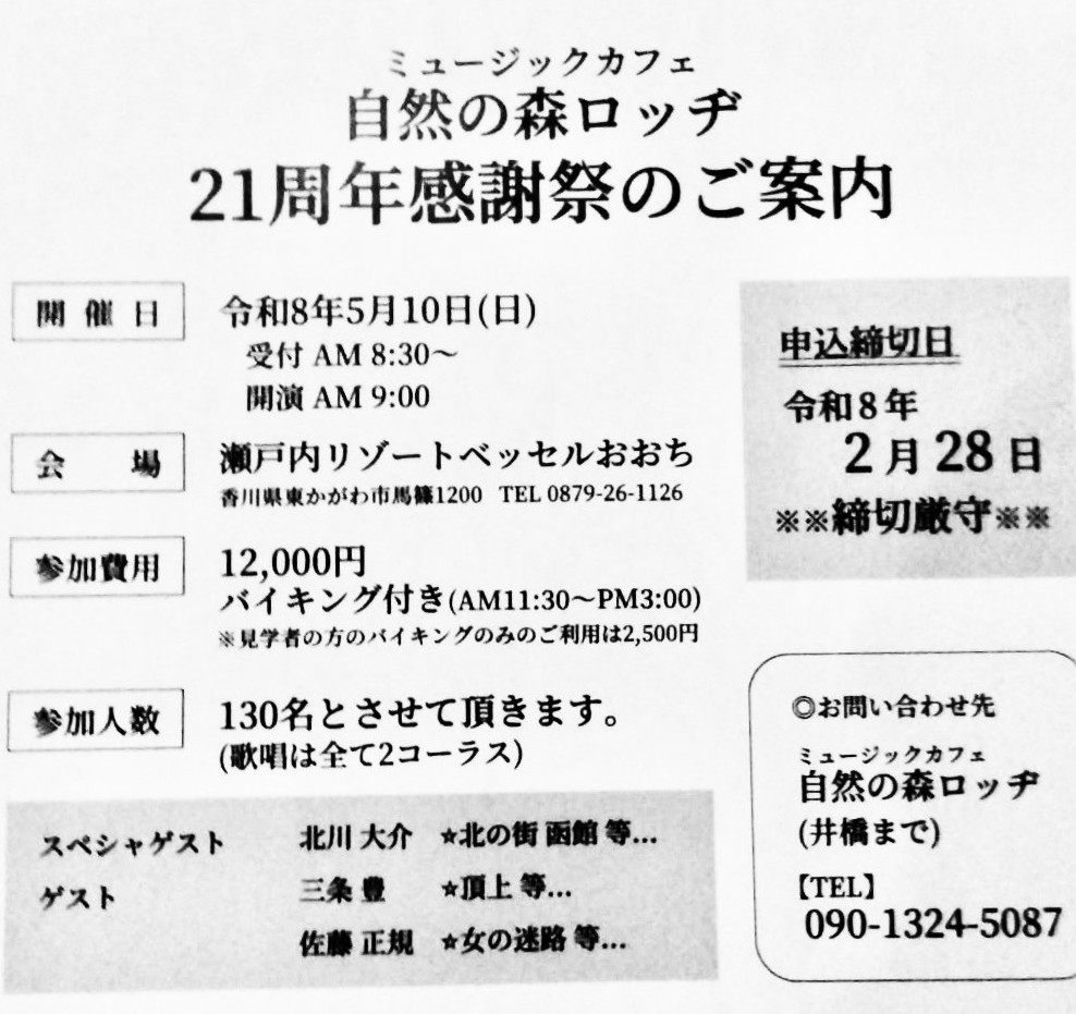 2026/05/10 ミュージックカフェ自然の森ロッヂ 21周年感謝祭【香川県】